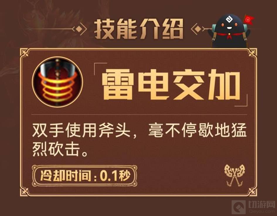 2、先来说一下狂战士的技能。以雷电交加技能为例,技能CD短只有0.1秒,会造成你持续性伤害,而且还可以击退敌人并保持一个霸体状态,这一点在刷图中作用很大,不会被控制,那自然输出就高了起来。该技能是狂战士的主要输出技能,一定要优先提示等级。