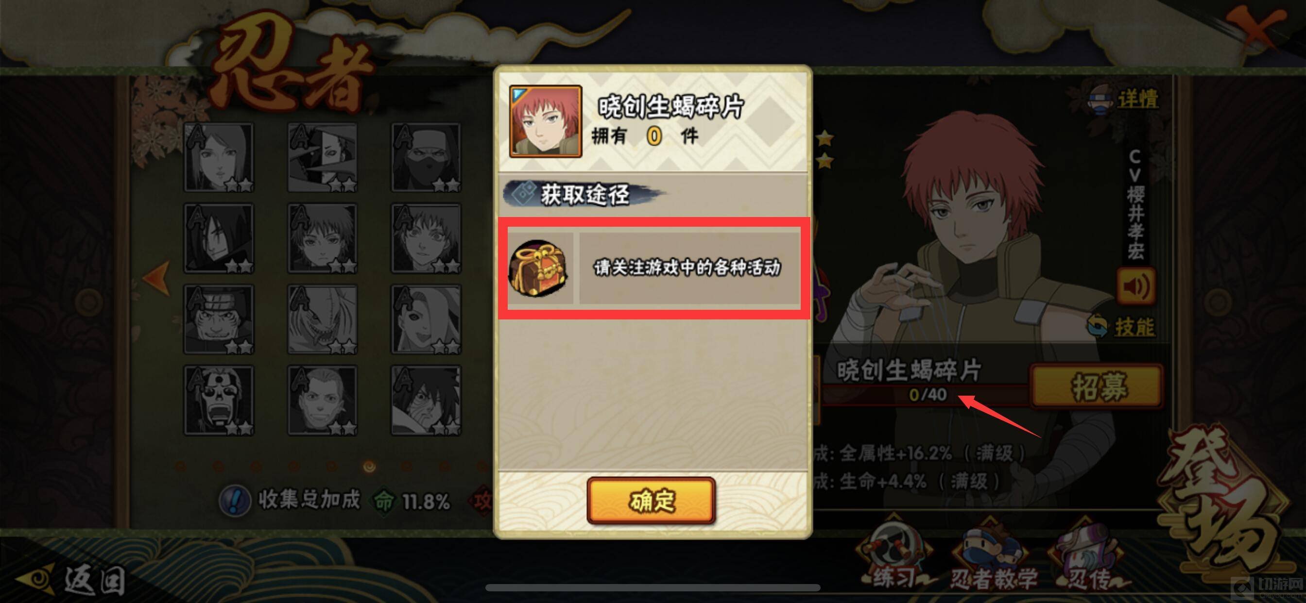 1、晓创生蝎是一位限定A忍,需要40个碎片才可以将他招募,获取途径只能通过游戏内的各种相关活动才能获取。