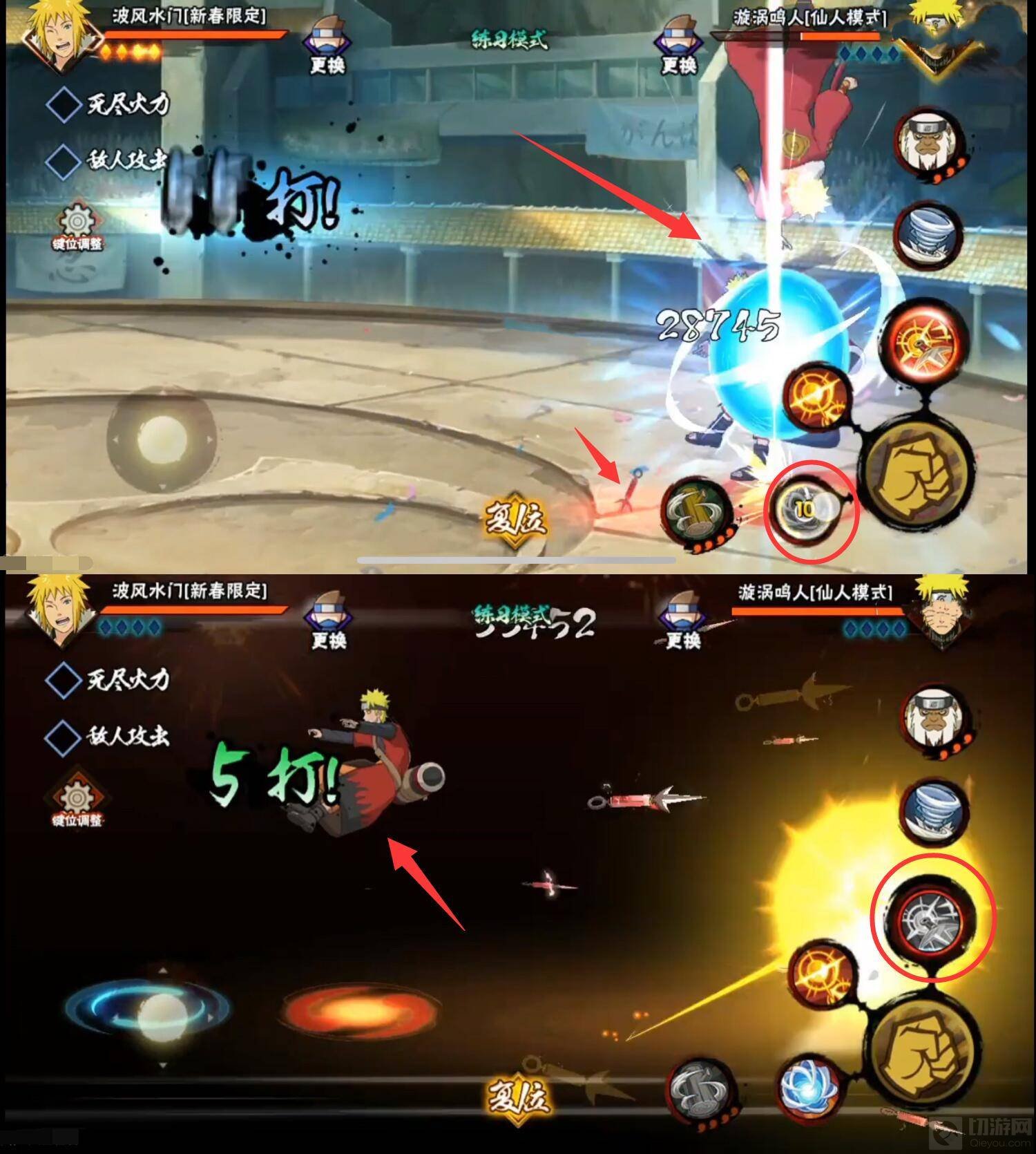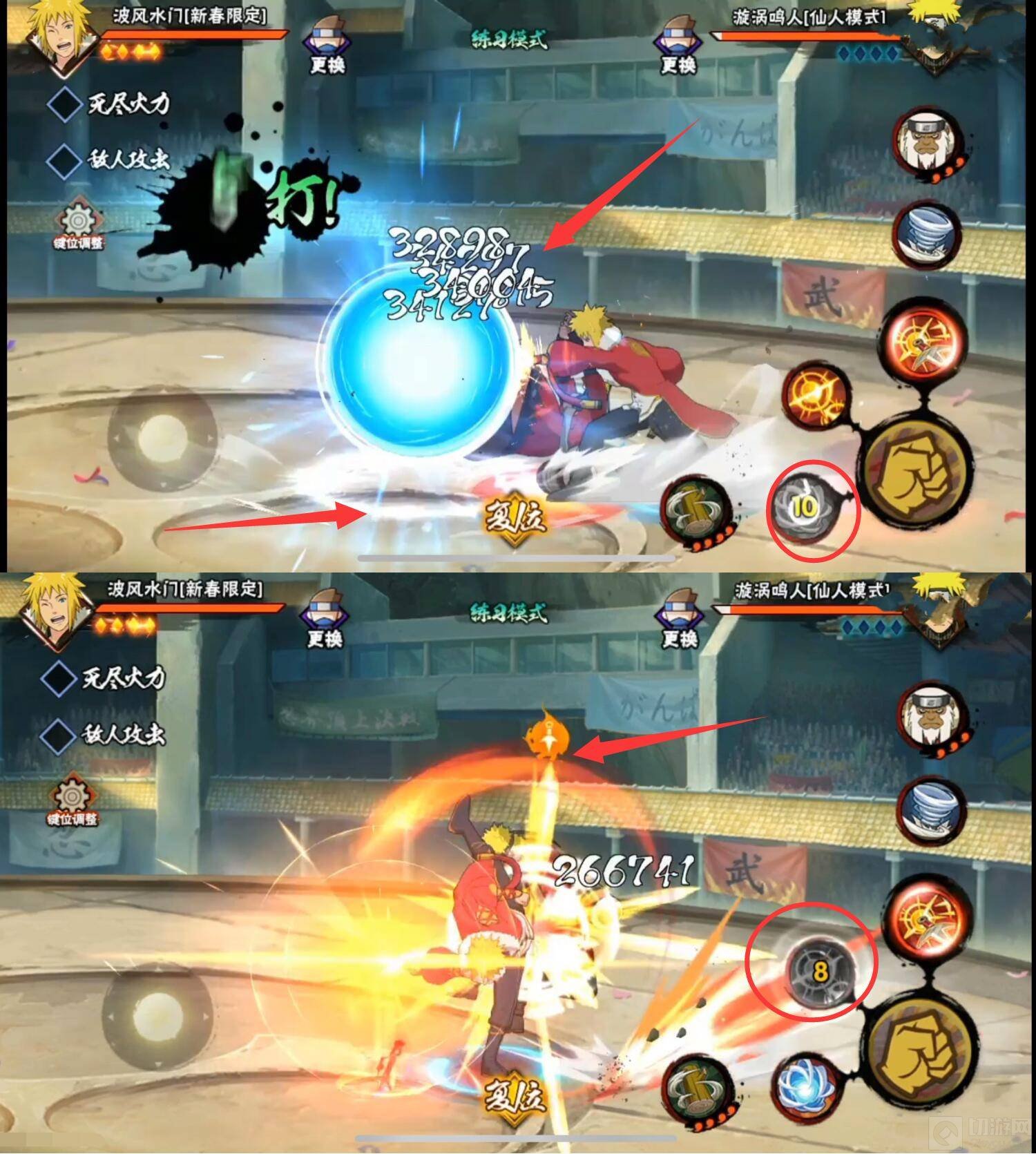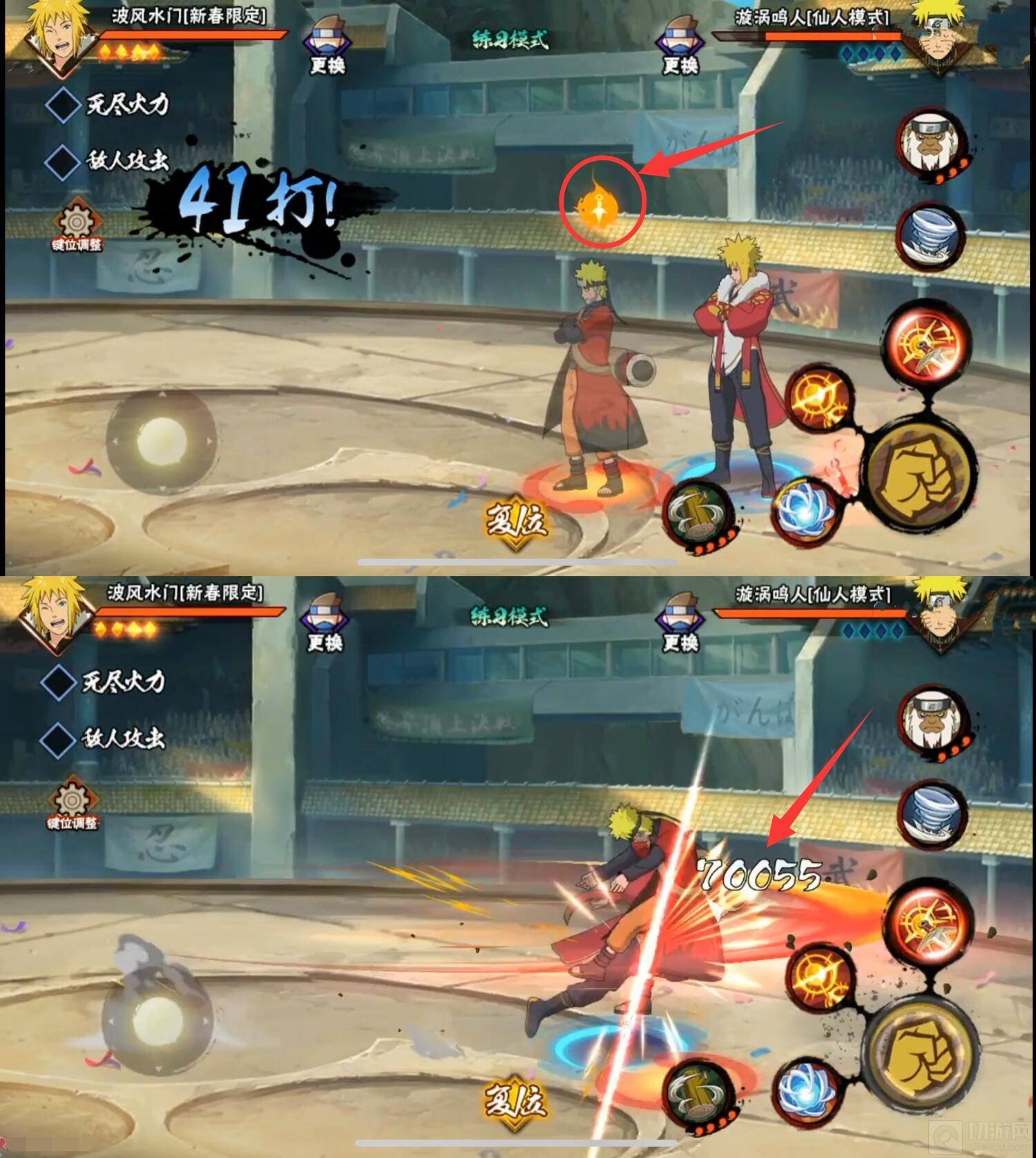 1、新春水门是一位限定A忍,他的普攻分为6段,前3A为平推,第4A标记,第6A带击飞效果,其中3A最稳,第4A苦无标记,捡起苦无可以打出强化普攻飞雷神苦无斩击,范围较广。