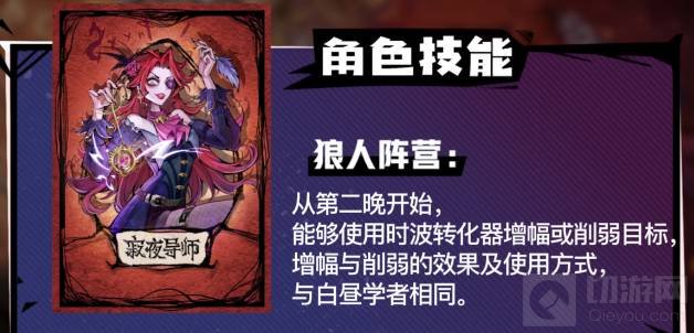 1、寂夜导师是狼人杀新板子“时波之乱”中的角色,本次板子有一个特殊之处,那就是白昼学者和寂夜导师的技能是一致的,那就是她们都可以对目标进行增幅或削弱,增幅可以让神职当晚多使用一次技能,狼人当晚多发动一次袭击,削弱可以让神职当晚技能失效,或是让狼人当晚不能出刀。