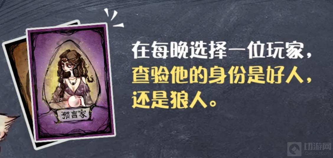 1、预言家的技能,是在每晚选择一位玩家,查验他的身份,究竟是好人还是狼人。