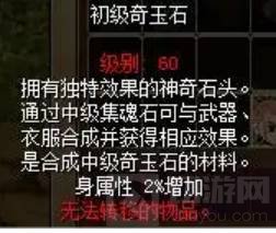 1.初级奇玉石可通过击杀怪物后随机掉落获得,出现概率较高。初级奇玉石可通过中级集魂石作为媒介用于增加已觉醒武器或护具的某一属性,初级奇玉石所加的属性最高为心属性5%,体属性5%,身属性5%,力属性5%,觉醒 2。初级奇玉石同时也是制作中级奇玉石所需的主要材料。