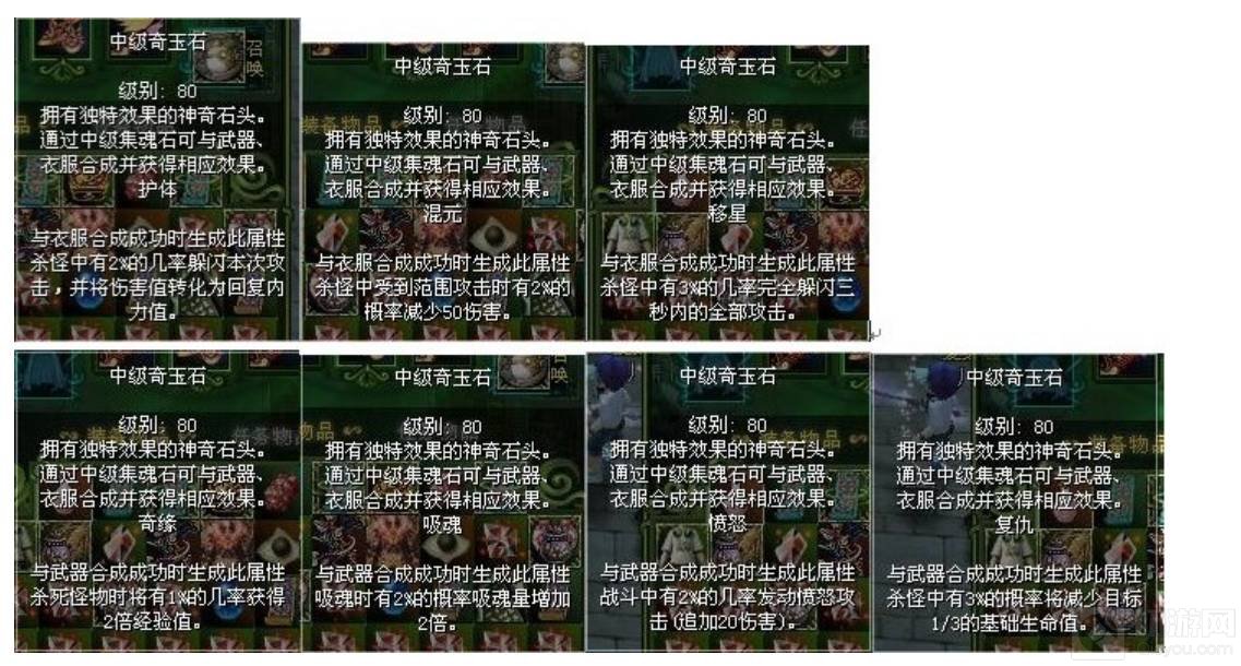 2. 中级奇玉石可通过击杀怪物后随机掉落,但出现几率极低,同时中级奇玉石也可通过在游戏内银币广场的NPC伟小贝处进行制作获得。中级奇玉石可通过中级集魂石作为媒介对已觉醒的武器和防具(衣服)附加中级奇玉石中所带的特殊效果。包括:1.复仇:杀怪有5%几率减少目标三分之一的基础生命值;2.愤怒:战斗中有3%几率发动愤怒攻击(追加20%伤害);3.吸魂:吸魂是有3%的概率吸魂提高2倍;4.奇缘:杀死怪物时有3%的几率获得双倍经验;5.护体:杀怪中有5%的几率闪躲本次攻击并将伤害转化为恢复内力值;6.混元:杀怪中受到范围攻击时有4%的概率减少50%伤害;7.移星:杀怪中有5%几率完全闪躲3秒内的全部攻击。