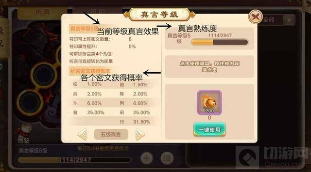 2、祈言孔位跟着真言级别对外开放,级别越好能够解锁孔位的越大,祈言获取的密文越好。