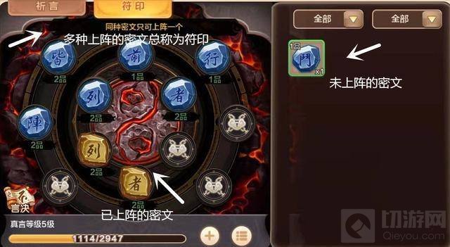 3、密文与符印:密文是祈言获取的,符印是多种多样上阵的密文总称,密文收进符印孔位里即为上阵。