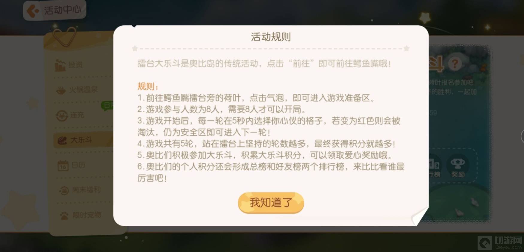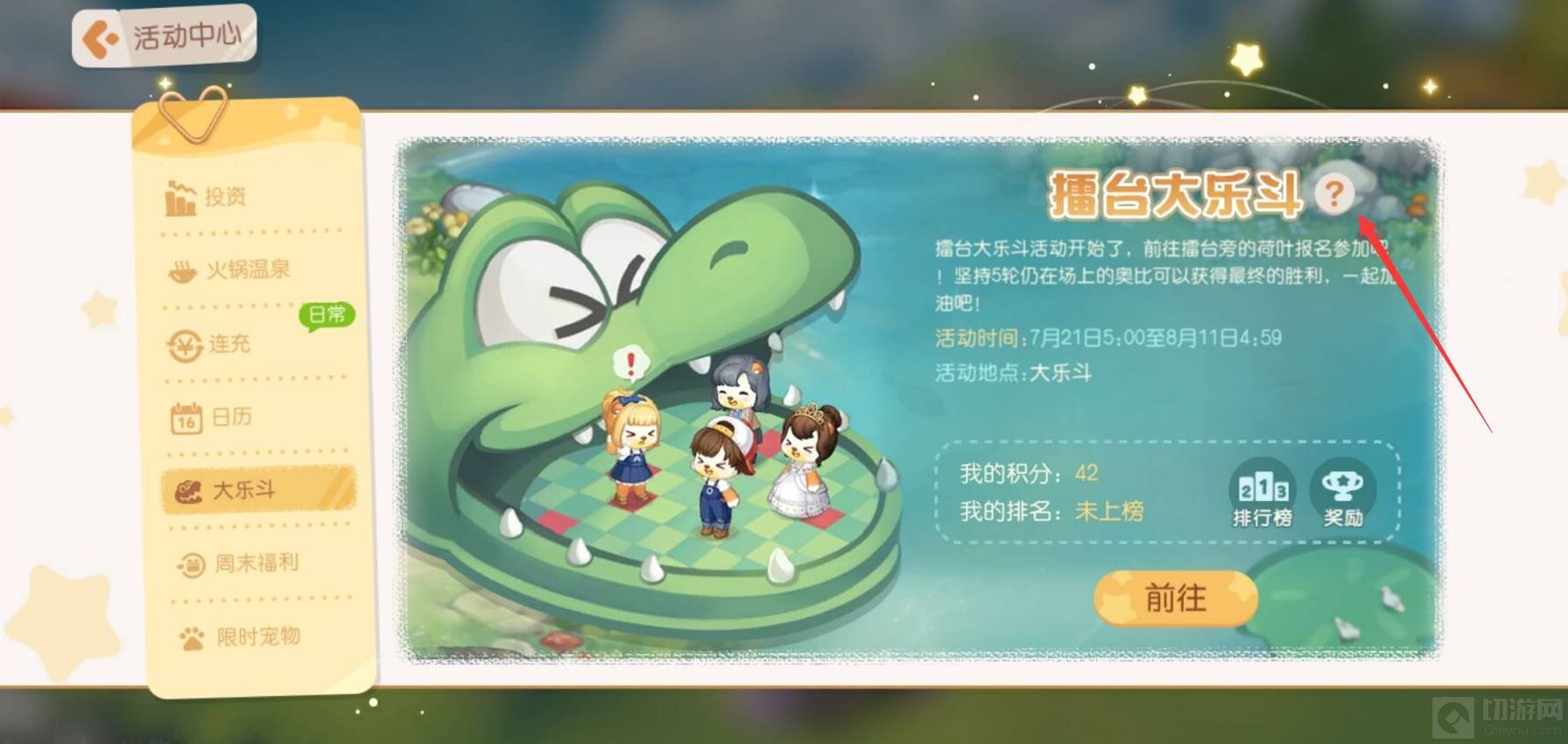 首先在活动中心点击大乐斗旁边的问号按钮。