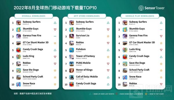 今日(9月22日),Sensor Tower公布软件商店8月全球移动游戏下载榜,Miniclip旗下SYBO Games《Subway Surfers地铁跑酷》以3350万次下载,位列8月全球移动游戏下载榜榜首,比2021年8月增长了89.4%。Kitka Games《Stumble Guys》以2650万次下载排名第2,是去年同期的8.7倍。排名前五的另外3款游戏依次Garena《Free Fire》、Zego Global《GT Car Stunt Master 3D》,King《 Candy Crush Saga》。