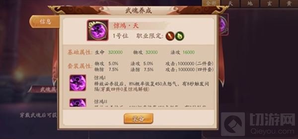 开启武魂系统,只要主角等级到达105级即可。开启后,每个武将都拥有天地玄黄四个武魂位,可佩戴对应位置的武魂。不同的武魂有不同武将职业限制要求,只有武将职业满足武魂条件才能够佩戴。武将佩戴同套武魂满足两件套,将激活套装属性;满足四件套后,不仅能激活套装属性,还将赋予武将新的作战特性,使武将在战场上的表现更上一层楼。