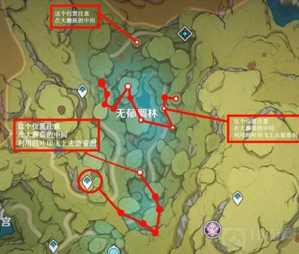 首先来到无郁稠林这里(图中有白色标记的都是在大蘑菇中间夹层里的)