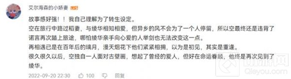 《等风吟》将原神的时间线挪到现代,以现代为主线,讲述空与绫华在古时候相遇的一段缘分。动画中,一切剧情可以说跟原神原本的设定没什么关系,但在人物形象、性格设计方面却又神奇地和原神人设贴合在了一起。稻妻的神里绫华在作者的大胆设计之下更是摇身一变,穿上国风服饰,手持唐刀版“天目影打刀”出境。虽然说剧情稍显离谱,但不得不说在美术风格和剧情的虐心程度上几乎不输原神原作,创出了新高度。