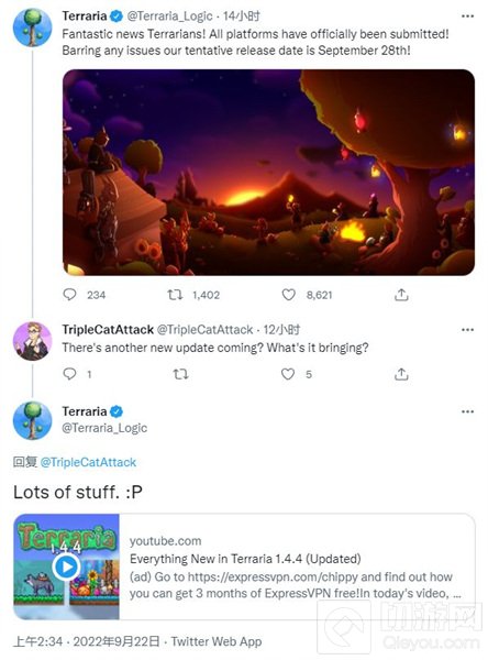 《泰拉瑞亚》官方宣布玩家期待已久的1.4.4更新将于9月28日在全平台推出,此次“Labor of Love Update(爱的劳动更新)”是对游戏最后一次大型内容更新的1.4版本“旅途的终点”的补充,修复了游戏相关平衡性,并添加了一些细节。