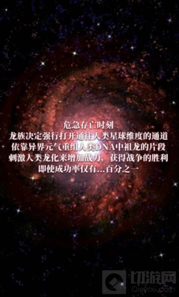 远古时期,天地毁灭,万物消亡,元气稀薄,以元气为生的龙族只能离开这个破碎的星球,前往浩瀚的宇宙寻找新的家园。而被遗留的人类,最终适应了恶劣的气候环境,并延续了下来······经过几千年的岁月,人类通过科技重新恢复了生活,而龙族则在与宇宙中未知种族的斗争中数量锐减,龙族的文明再次危在旦夕,危机存亡时刻,龙族决定强行打开通往人类星球维度的通道,依靠异界元气重组人类DNA中祖龙的片段,刺激人类龙化来增加战力,获得战争的胜利,即使成功率只有······百分之一。