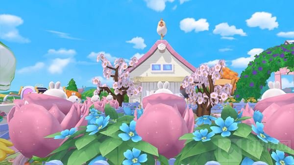 转身回头看,是一座同样粉色童话风格的农舍,掩映在粉嫩的花丛中,还藏着许多可爱的小兔子~