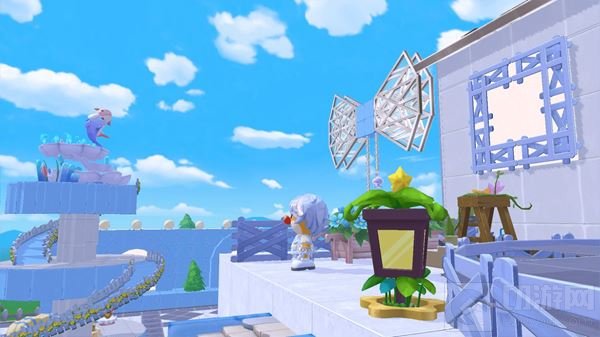 整个城堡的设计简洁大气,主色调为蓝色,除了城堡主体,不远处还有一座同色系旋梯高塔。