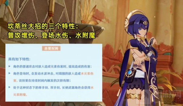 从以上三点特性便可大致得知坎蒂斯的就业方向:水附魔看似不错,不过目前不少角色自身就带有不被覆盖的附魔机制,所以更可能出现在各种骚套路中,比如永冻流凯亚;队友登场发动水波冲击,相当于提供了后台挂水机制,但条件是角色登场并且触发次数有限,挂水频率可能不太乐观;普攻伤害提升,需要普攻增幅的角色有宵宫和绫人,而同类型辅助有云堇。