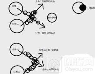 交叉吐就比中吐难多了,真的很难,同样,有分身时,先中吐,然后一边吐一边慢慢拉操纵杆,拉到差不多一半,你就会发现袍子“神奇”(有几个“神奇"-_-\\)地交叉吐了出来。更厉害的球球,可以做到“聚点吐”,就是两个分身的球吐到一个点上。