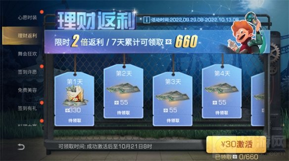 限时2倍返利!即日至10月13日8点,激活理财返利活动,成功激活后可领取时间至10月21日8点,每天登录均可领取支票,7天累计可领660支票!