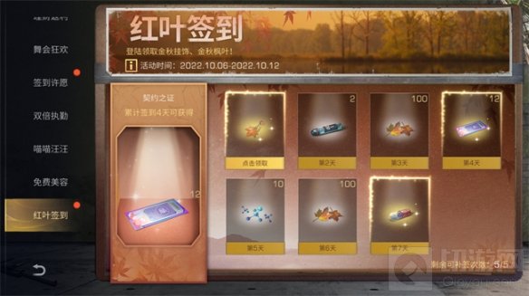 10月6日-10月12日期间,每日登录可获得一次领取奖励机会,累计签到特定天数可获得一叶知秋挂饰、金秋枫叶、契约之证、基因胶囊等丰厚奖励。