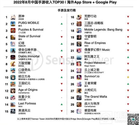 9月20日,Sensor Tower公布了2022年8月中国手游产品在海外市场收入及下载量排行榜,详细榜单变化如下。