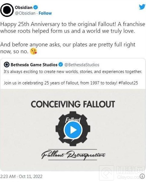 黑曜石表示:“祝《辐射》25周年快乐。在你们问之前直接回答:我们的任务太多了,所以没时间开发《辐射》系列新作。”