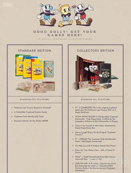 实体典藏版包含游戏本体、DLC“最后的美餐”6张可收藏趣味卡片,杯头俱乐部会员卡、MDHR工作室内部独家艺术绘画、约8英寸高的茶杯头提线木偶、手摇机械八音盒、实体地图、木偶展示外盒等。