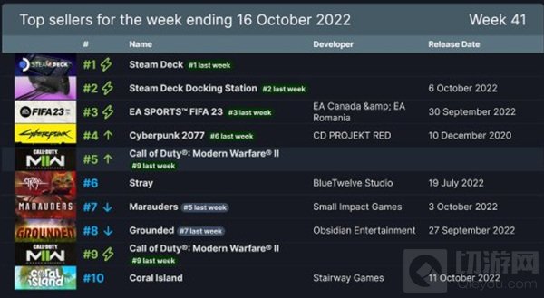 截至10月16日,Steam新一周销量榜公开,V社掌机Steam Deck二十连冠,受《边缘行者》播出影响,《赛博朋克2077》排名上升至第四,流浪猫扮演游戏《流浪》则重回榜单位列第六名。