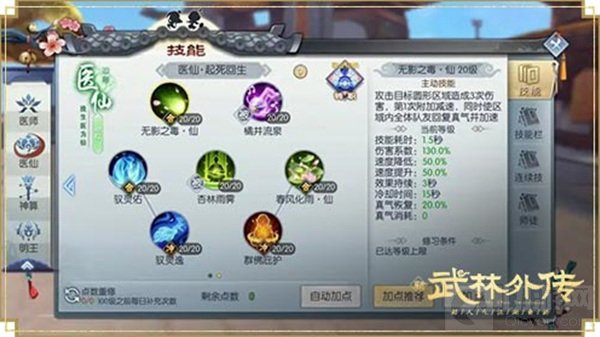 医仙这次主要加强了辅助能力,输出方面以冰心玉壶、无影之毒·仙、破衲功为主,舍弃了伤害低的海底针和破魔箴言,必要时可以开反伤护盾来弥补。少侠们可以结合自己理解,进行不同的加点分配,感受此次医仙的不同之处!
