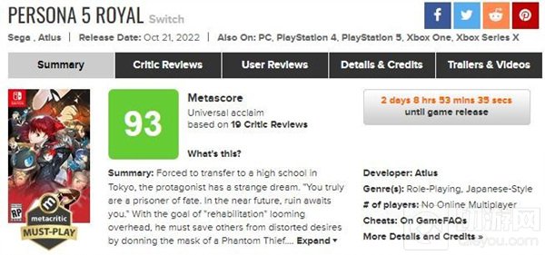 NS版《女神异闻录5:皇家版》的媒体评分已经出炉,M站均分93分。