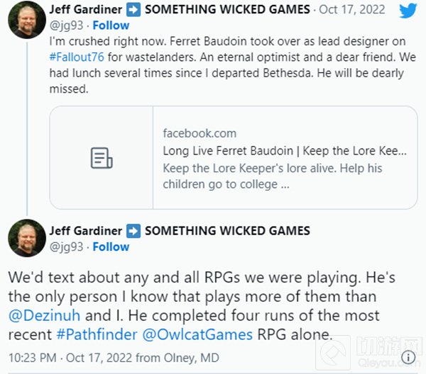 《辐射76》项目前负责人Jeff Gardiner在推特上分享了Ferret Baudoin去世的消息,他将Baudoin描述为“永远的乐观主义者和亲爱的朋友”,并且是一位非常忠实的RPG粉丝。