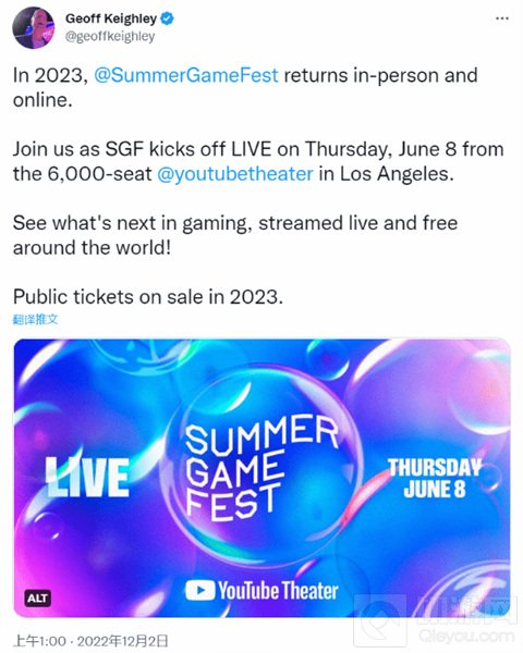 昨日,TGA主持人Geoff Keighley宣布2023年夏日游戏节将回归线下,于2023年6月8日在洛杉矶举行,油管同步进行线上直播。