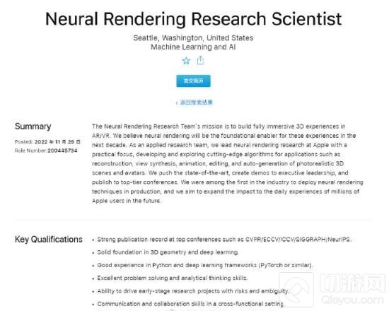 公告显示,苹果公司旗下神经渲染研究团队正在招募一名神经渲染研究科学家,苹果希望通过招募该人才可为AR/VR构建完全沉浸式的3D体验。