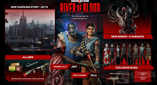 名为“血河”的新DLC为玩家带来了丰富的内容。这包括在战役中添加第6章,新的盟友Jeff和清洁工Tala也将加入玩家,他们将面对新的敌人Ridden以及2个新变异体。除此之外,还增加了8个专属角色皮肤,12个专属武器皮肤、新武器、新配件和卡牌。