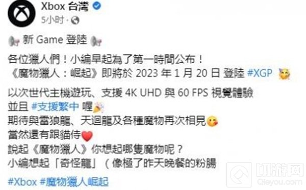 Xbox官方发布动态,明确表示《怪物猎人:崛起》支持繁体中文语言!由于是台湾地区的账号,因此没提简体中文的事,但这并不意味着仅支持繁中,玩家们可以等待大陆地区Xbox官方的公告。