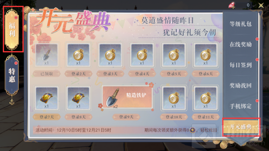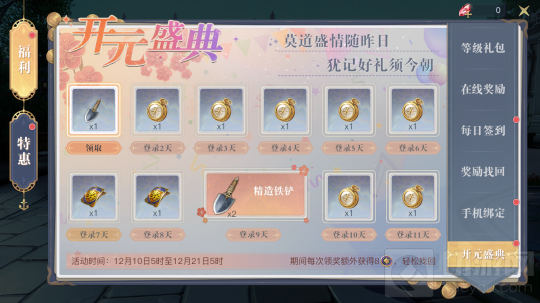 开元盛典是一个10日登录领礼品的玩法,为了欢度双旦佳节,在10天的活动期间,每日上线都可以领取一次奖励,奖品包括精造铁铲、宝藏奖券和寻宝罗盘等道具。