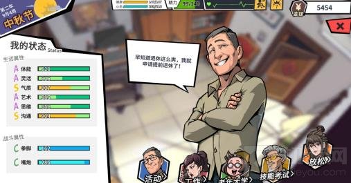 而在遇到一些棘手事件的时候,你将会进入战斗姿态并和对面这群不知天高地厚的后生们比划一番,这一环节融入了“CCG卡牌构建”的玩法设计,且无敌嘴炮加二脚踢分别对应心态和健康两种数值设定。