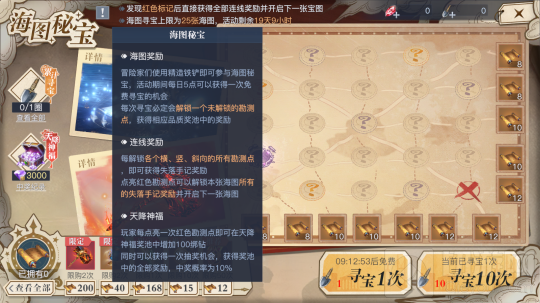玩家使用精造铁铲可参与海图秘宝,根据挖出海图内容可以获得不同的奖励,每解锁各个横、竖、斜向的所有勘测点,即可获得失落手记奖励。如果能点亮红色勘测点可以解锁本张海图所有的失落手记奖励并开启下一张海图,失落的手记用于在商店中兑换【限定珍宝】等珍稀奖励。