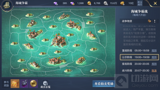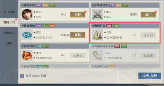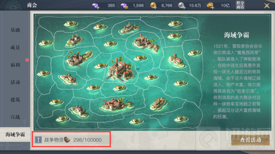 活动在主界面的【商会】——【海域争霸】中进入,或者是在主界面的【活动】——【限时开启】中进入。在商会中进入海域争霸后,可以显示自己商会的战争物资,通过使用战争物资进行竞价,战争物资可以在日常活动或商会联赛中获得。