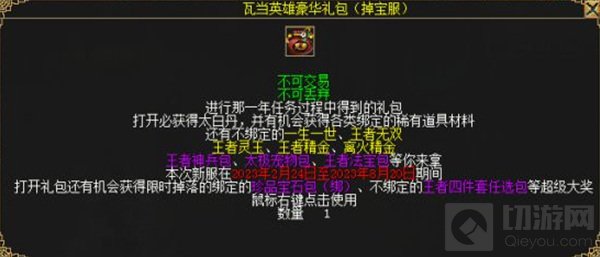 所有新服玩家参与“那一年”任务,可获取新服专属瓦当英雄豪华礼包,除了有机会获得一生一世、王者无双、王者神兵包、太极宠物包、王者法宝包等丰厚奖励外,新服玩家还有机会获取限时掉落的珍品宝石包和王者四件套任选包,这次BOSS掉宝新服提升了珍品宝石包的掉落概率,玩家将更容易获取道具,变强之路更舒坦!