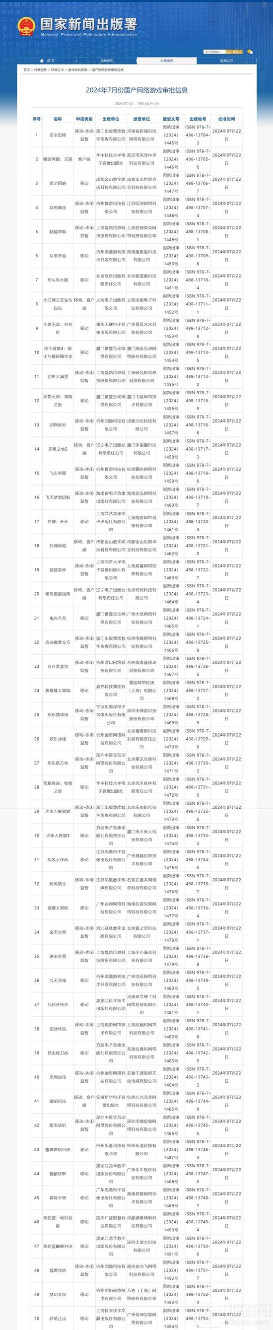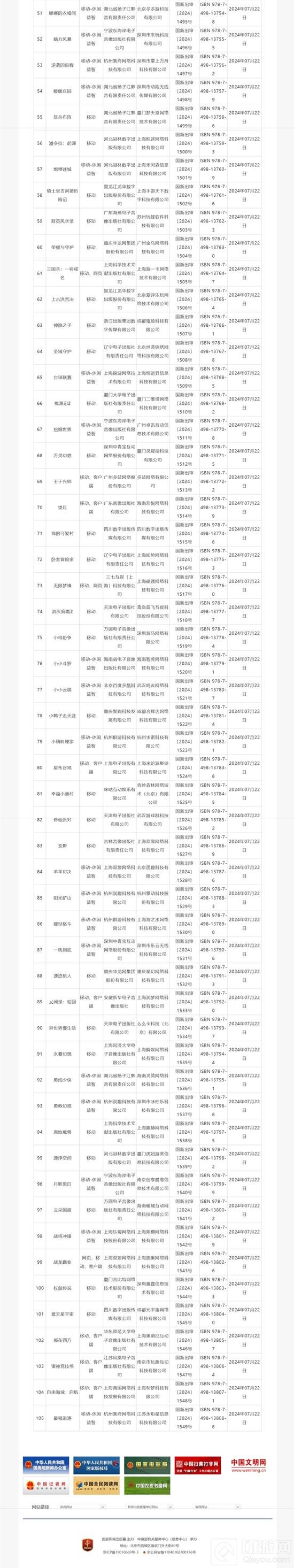 昨日,国家新闻出版署公布了2024年7月国产网络游戏审批版号名单,共有105款游戏过审。