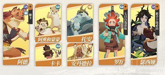其中阿德是紫卡、商人罗万可以7日自选获取,瑟西亚新手第一发十连抽必出,奶爸与骨王可用卡卡、豹女下为替代,让你前期推图无忧。