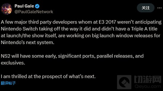 Paul Gale表示:“任天堂Switch 2将会有一些早期的、重要的移植、平行发布和独占作品。我对接下来的前景十分兴奋。”