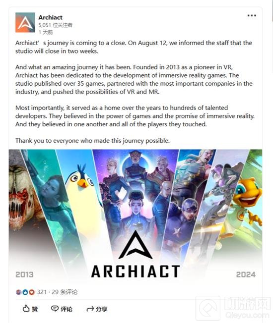 在关闭之前,Archiact曾在2024年1月份进行了一轮裁员。当时,根据其LinkedIn资料,公司规模在51至200名员工之间。Archiact在声明中表达了对所有支持他们旅程的人的感谢,并特别提到了多年来为工作室服务的数百名才华横溢的开发者,他们相信游戏的力量和沉浸式现实技术的前景。