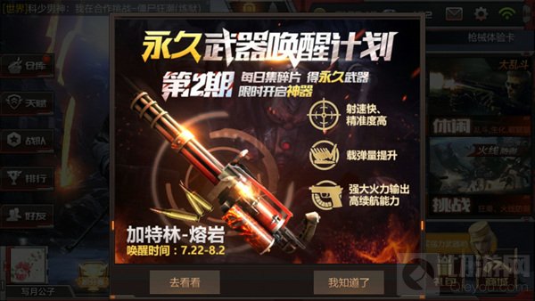活动介绍:完成每日任务手机60个碎片就可兑换永久武器加特林-熔岩,每日最多可获取6个碎片只需10天即可集齐永久加特林-熔岩。