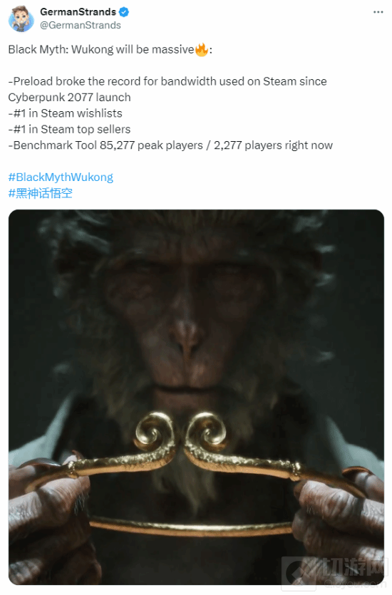 国外游戏资讯推主 GermanStrands近日在社交媒体上发文,对《黑神话:悟空》的惊人表现给予了极高的评价。他提到,《黑神话》在预载阶段就打破了自《赛博朋克2077》以来Steam平台上的带宽使用纪录,同时在Steam愿望单和畅销榜上均位列第一,测试工具的在线峰值人数更是达到了8.5万人,这些数据充分展示了该游戏在全球范围内的火爆程度。
