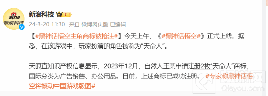 据新浪科技报道,热门游戏《黑神话:悟空》中的主角商标“天命人”遭遇了抢注。