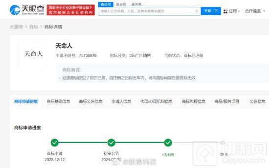 天眼查知识产权信息显示,2023年12月,一位自然人王某成功注册了两枚“天命人”商标,其国际分类分别为广告销售和办公用品。这一事件引起了游戏业界和玩家群体的广泛关注。