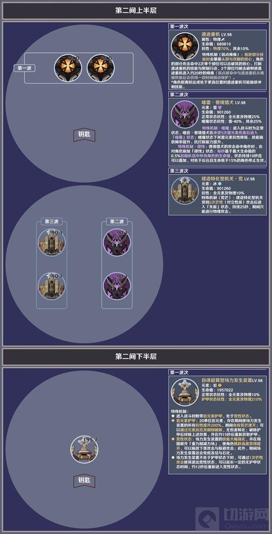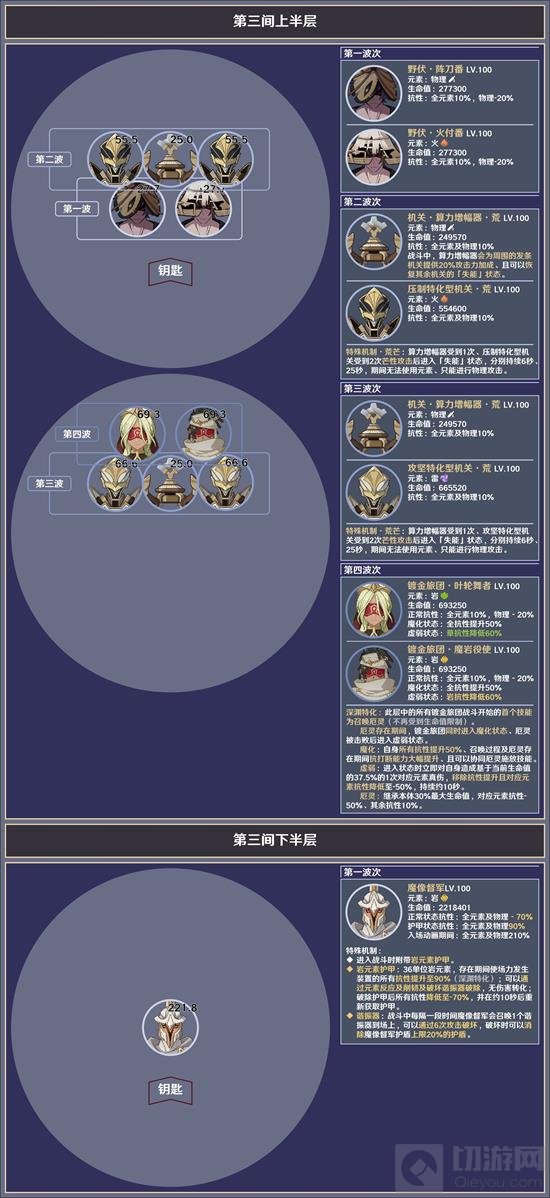 下半:单波次对单,敌人同样带有岩元素护甲,破除后抗性额外降低。建议与第二间类似,迅速破除岩元素护甲,随后利用芒性攻击进一步削弱敌人。