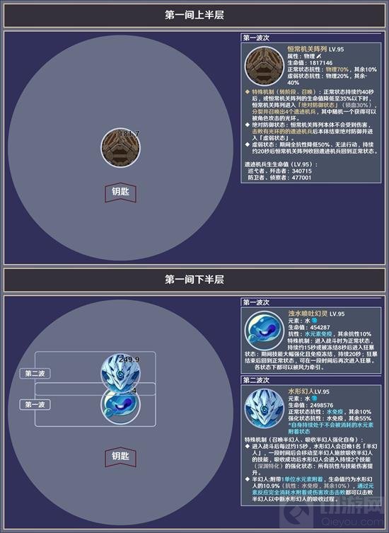 下半:双波次对单,敌人免疫水元素伤害且持续附着水元素。建议避免使用水元素角色,利用敌人持续附着水元素进行元素反应。
