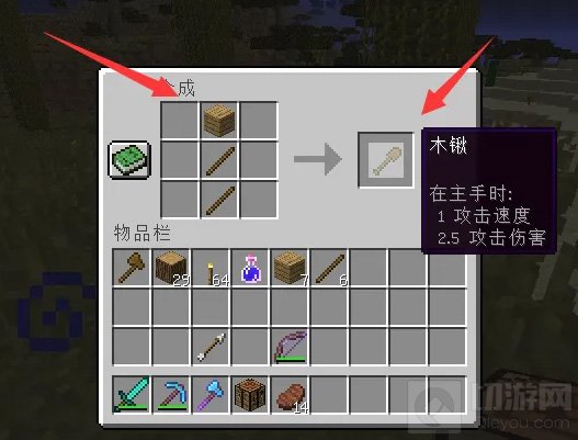 铲子的合成方法是将对应材料放置在工作台的特定位置上。