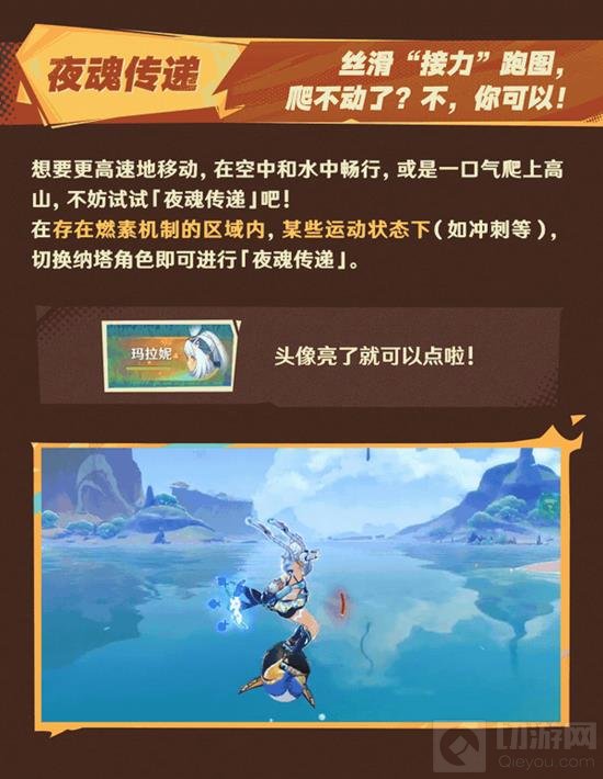 当玩家在纳塔地区探索时,可以利用「夜魂传递」来实现快速移动。在存在燃素机制的区域内,玩家在某些运动状态下(如冲刺等),只需切换头像点亮的纳塔角色即可进行「夜魂传递」,从而继续享受夜魂加持带来的便利。
